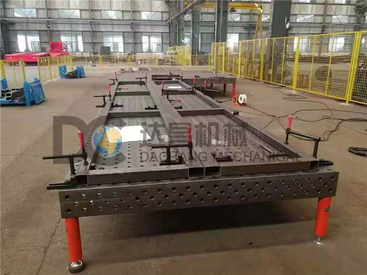 多孔三維焊接平臺特點(diǎn) 1經(jīng)濟(jì)性每次產(chǎn)品變化而投入的專用工裝的費(fèi)用時間幾乎可以不再花錢。裝置操作簡便。用戶可根據(jù)需要快速拼接出不同要求的工裝就像兒童玩拼裝式玩具一樣。 2多孔三維焊接平臺的承載能力高,鋼性穩(wěn)定,它的五個面均加工有規(guī)則的孔,并刻有網(wǎng)線。焊接平臺可方便地延伸和擴(kuò)展,組合。經(jīng)擴(kuò)展的標(biāo)準(zhǔn)臺面可模塊化的定位和夾緊直接連接在一起。在安裝、調(diào)整和定位工件過程將柔性三維組合焊接工裝系統(tǒng)的通用功能展示的詳細(xì),尤其在了大型工件方面的應(yīng)用上。拼裝方式多樣,用戶只要充分發(fā)揮想象力,幾乎可達(dá)到任何專用夾具同樣的定位和夾緊功能。拼裝快速,裝拆方便;工作臺面可以根據(jù)工件形狀、大小進(jìn)行拼裝組合。臺面上的刻度和模塊尺寸的設(shè)計(jì),使操作工人不用量具就可以根據(jù)工件尺寸迅速搭出所需要的工裝。 3多孔三維焊接平臺再1噸左右集中載荷的作用下,其變形量只有0.553mm,而再均布載荷作用下,其變形量只有0.024mm,可以滿足絕大多數(shù)的焊接及裝配加工的需要,其組建的精度高,工作平臺定位孔中心公差保證在0.05mm以內(nèi)。這種高精度將會反映在用戶所加工的產(chǎn)品中,因此此工作臺也可用作檢具的基準(zhǔn)平臺。 4多孔三維焊接平臺的臺面有鑄鐵/鋼結(jié)構(gòu)件/精密加工件/模塊化組件組合而成,其性能非常穩(wěn)定,如使用不當(dāng)造成部件損壞時,也不用報(bào)廢整張臺,只要非常少的成本就可以更換單個部件。焊接平臺表面經(jīng)過加工處理,在焊接過程中,僅需低廉的防飛濺液即可免除工作臺表面的焊接飛濺。 5模塊化所有組件分門別類,進(jìn)行了標(biāo)準(zhǔn)化和系列化,互相匹配。選用較少的模塊,就可以實(shí)現(xiàn)各種快速定位和夾緊的功能。